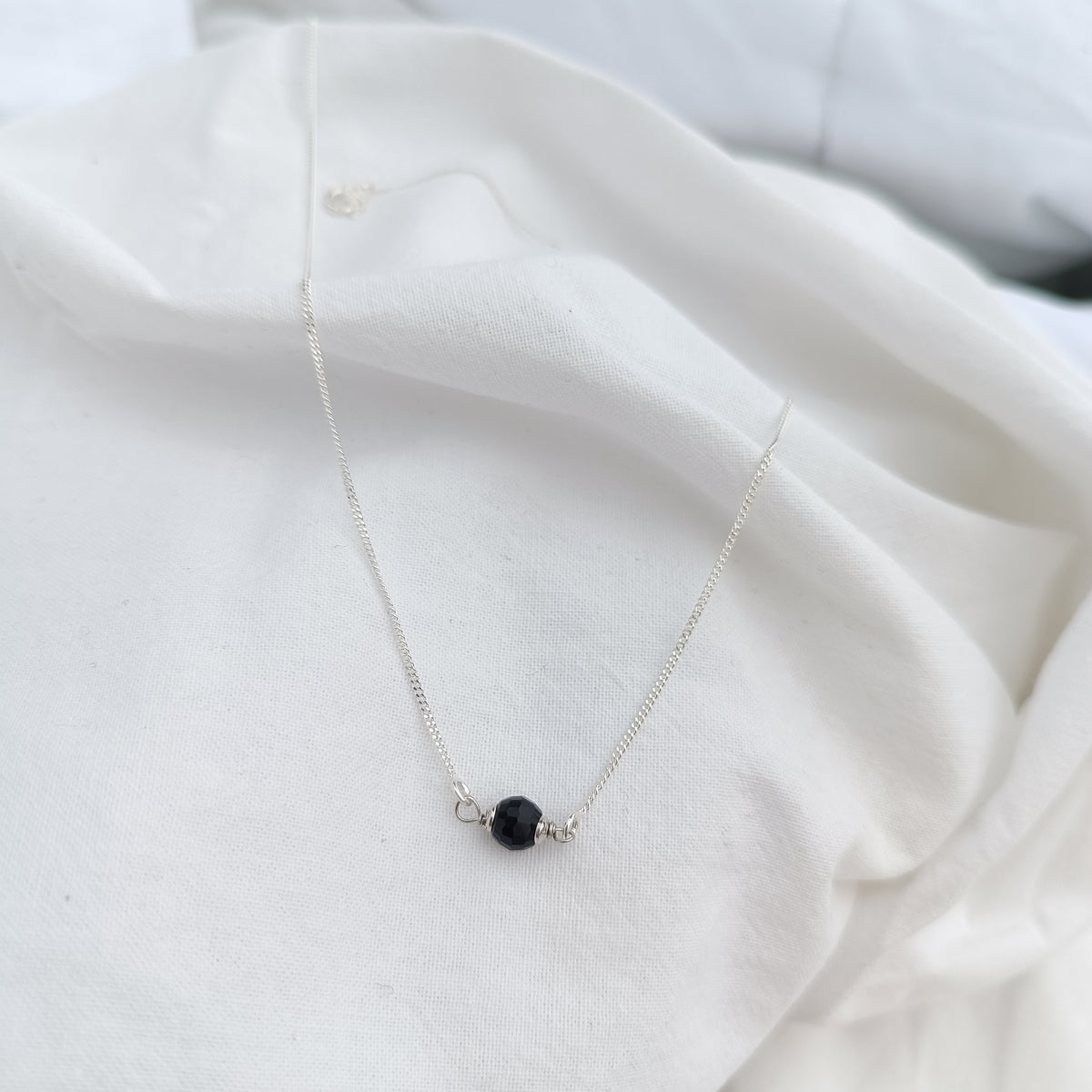 L'onice nera sfaccetta racchiude il mistero della notte creando riflessi inattesi, come un sussurro sospeso nella luce ricreata dalla collana d'argento.