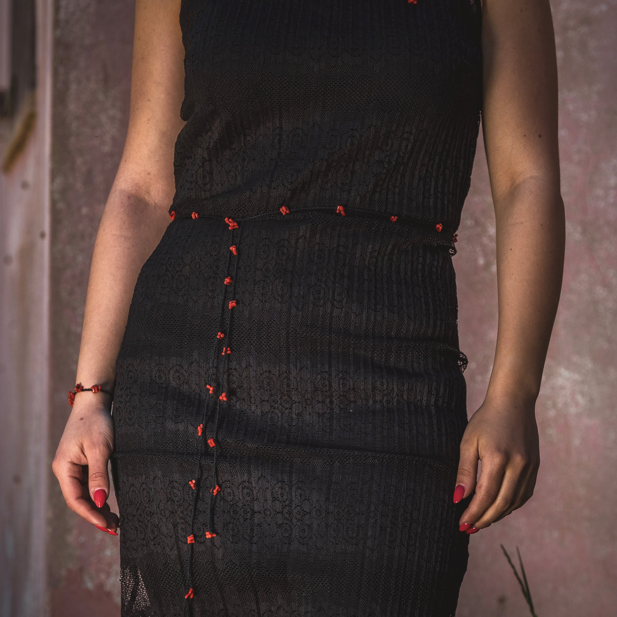 Collana lunga circa 125 cm, realizzata con spezzati di corallo rosso di Alghero di prima scelta, infilati su 7metri di cotone nero lavorato a crochet.