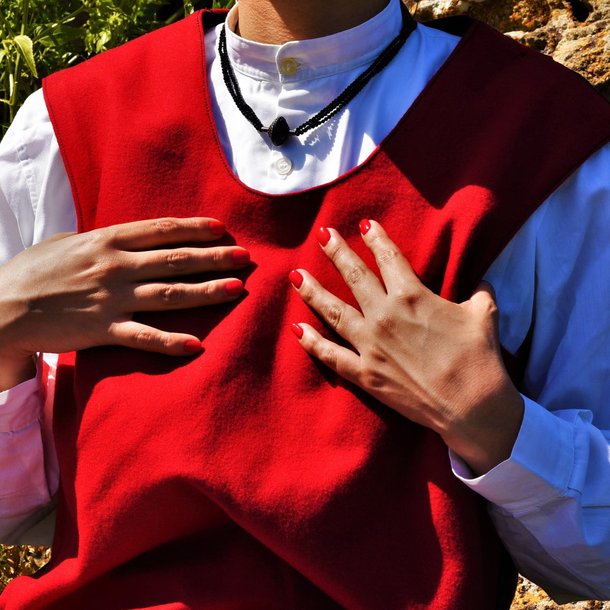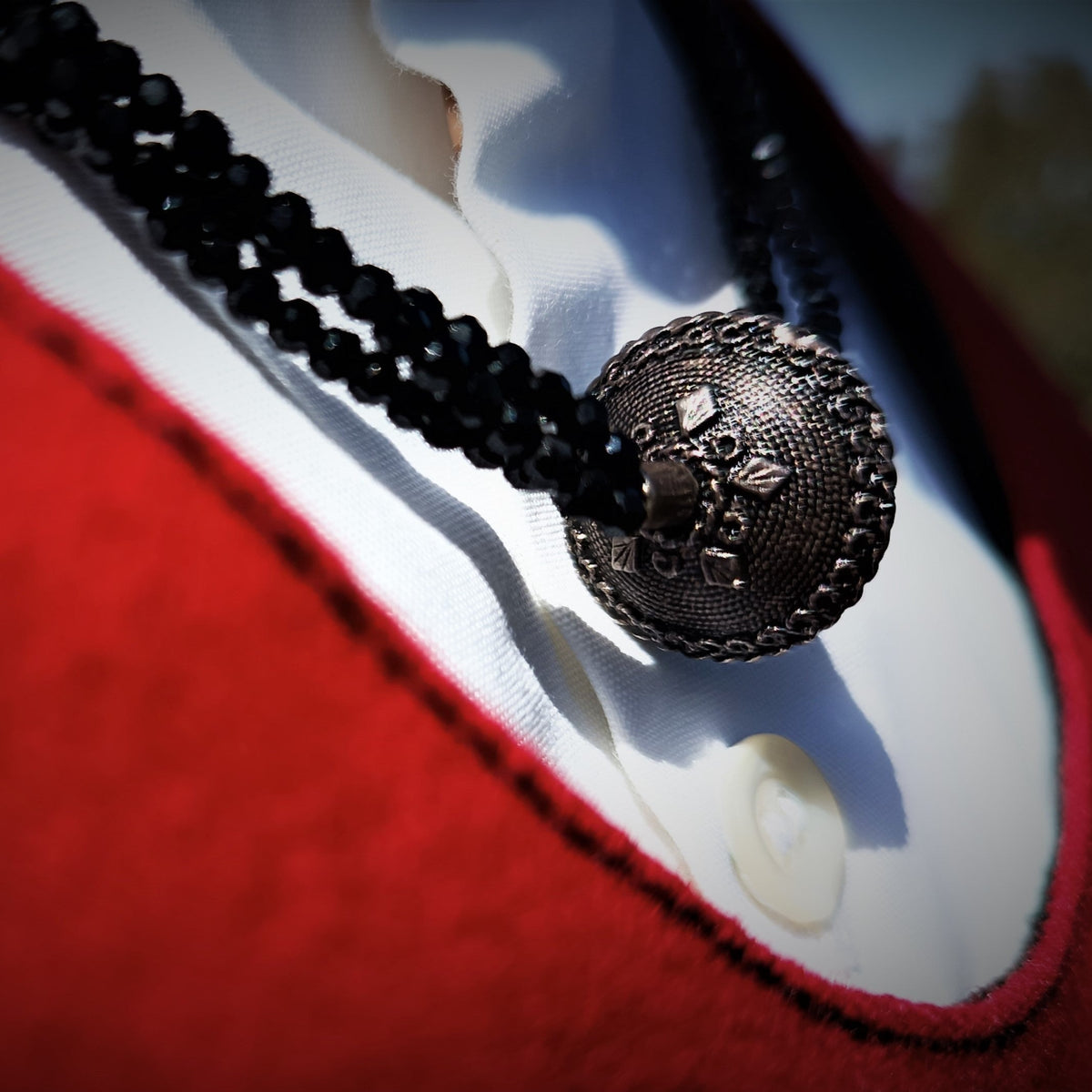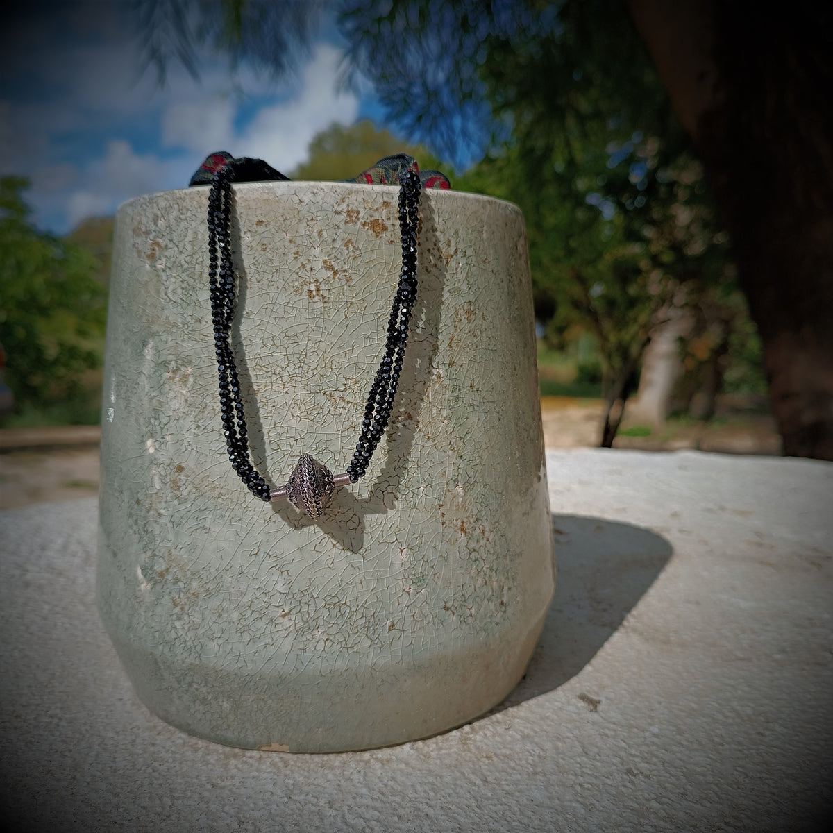 Impreziosita da un bottone sardo lavorato a mano, trapassato da tre fili di onice nera sfaccettata legati in un abbraccio indissolubile da un nastro di broccato sardo, Sa Cannacca Niedda è una collana elegante, raffinata ma capace di adattarsi a qualsiasi occasione.